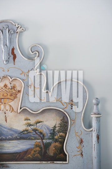 A close-up of a crown and outdoor mountain scene hand painted on an antique headboard.