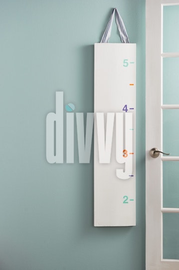 A handmade height measuring board hangs on a pale blue wall next to a glass-paneled door.