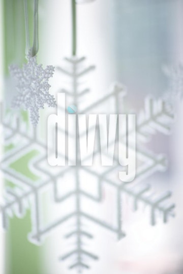 Two snowflake ornaments of different sizes hang from light green ribbons on a white and green background.