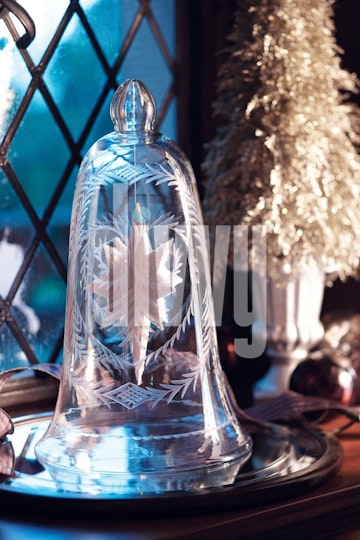 A snowflake decoration hangs from a glass cloche on a table with holiday decor in the background.