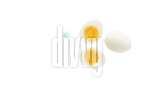 One whole hard-boiled egg and one cut in half sit on a white surface.