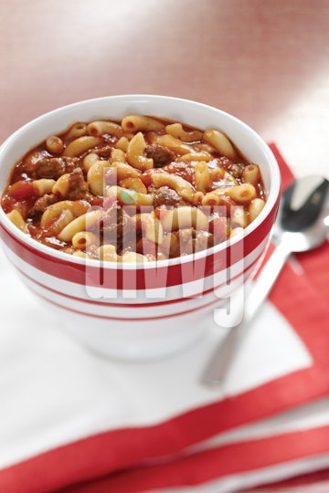 A red-and-white-striped bowl is filled with a hearty goulash.