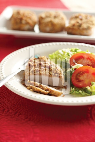 A pecan-and-herb-crusted pork chop is sliced on a plate with a side salad.
