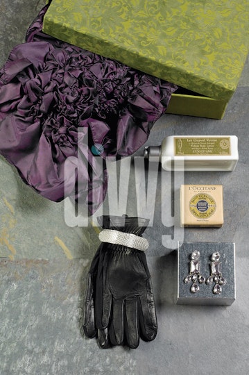 A pair of glass chandelier ornament earrings, silver bracelet, soft black leather gloves, body lotion, shea butter soap, and purple scarf arranged near green gift box on grey tile.