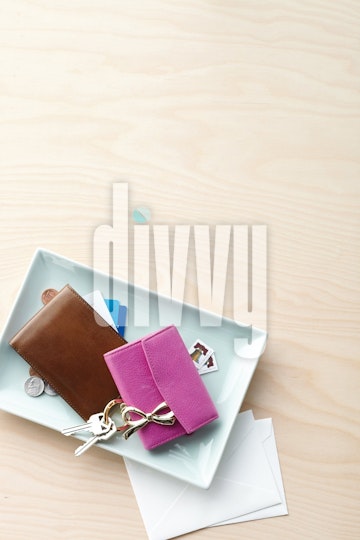 A pink wallet and a brown wallet rest on a catchall plate on a wood surface with other items.