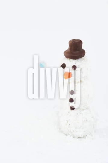A snowman is made from cookie balls covered with coconut flakes and decorated with chocolate for the hat, buttons and eyes and candy for the nose and sits on a surface covered with coconut flakes.