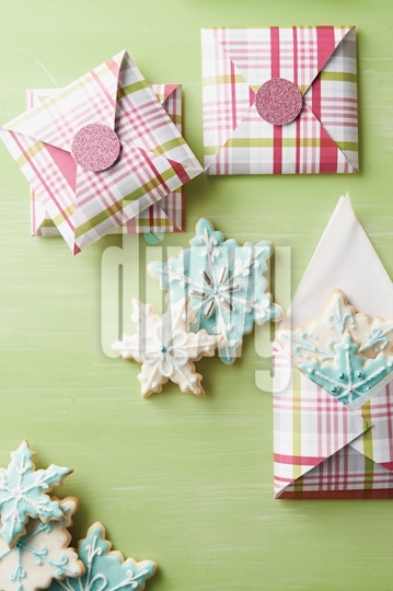 Decorated snowflake sugar cookies are pictured with handmade plaid packaging for giving.