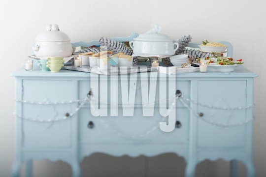 A winter dinner party soup spread is served on a decorated light blue antique buffet.