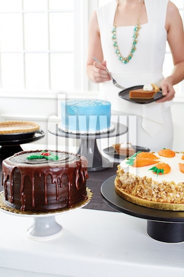 A woman in a white dress holds a plate of pumpkin pie at a dessert table with holiday decorated bakery cakes and pie served on cake stands at a dessert table.