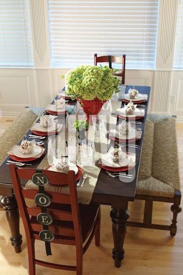 Mahogany table set with red and white tableware, caramel apples, green centerpieces and noel sign.