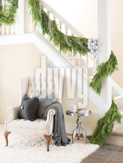 A button tucked beige chair sits in front of a white spindle staircase wrapped with greenery and beads for Christmas.