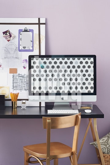 Home office set up with a desk holding a computer, keyboard, pin-up board and office supplies.