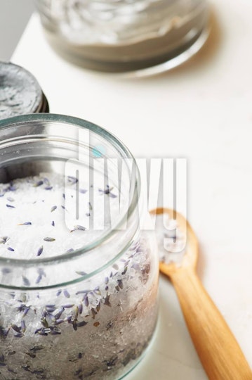A glass jar holds homemade lavender bath salts made from Epsom salt, dried lavender and lavender essential oil.