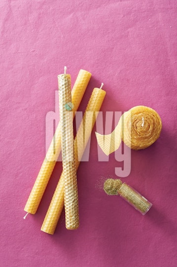 Handmade rolled beeswax candles are in the process of being covered with glitter.