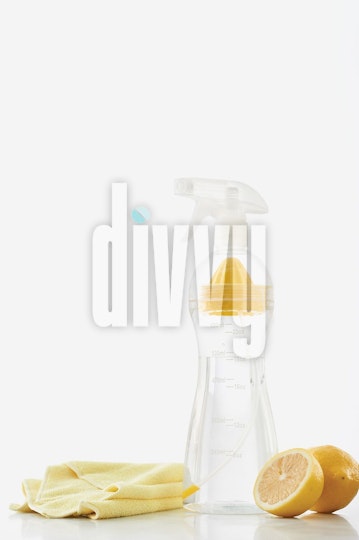 A clear bottle holds homemade lemon all purpose cleaning spray next to a cleaning towel and cut lemons.