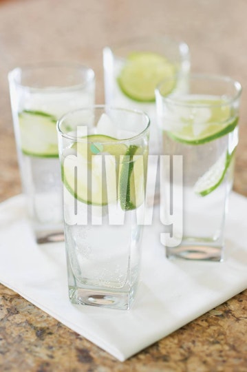 Tall glasses of cucumber water are served on a white napkin on brown kitchen countertop.