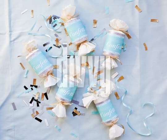Homemade party poppers are surrounded with paper confetti on a blue tablecloth.