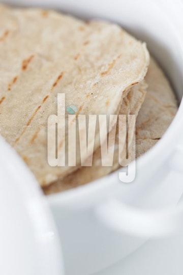 Homemade grilled flour tortillas are stacked in a serving dish.