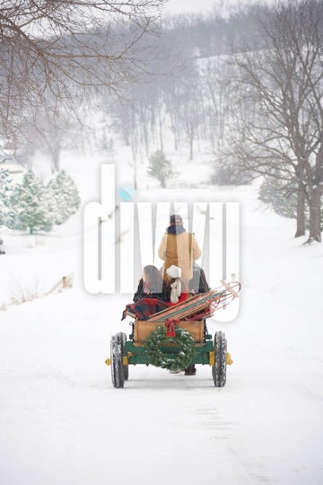 A horse pulls a wooden cart holding two girls with sleds down a snowy road.