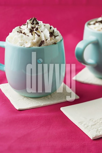 Hot chocolate is topped with whipped cream and chocolate flakes and served in a teal mugs.