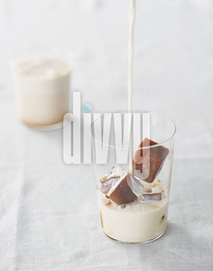 Milk pours into a glass containing frozen chai cubes with another glass of iced chai in the background.