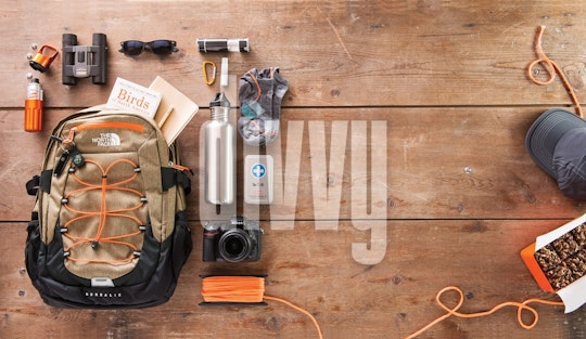 Items for outdoor activities—a camera, water bottle, socks, sunglasses, binoculars, rope, first aid kit—are arranged around a backpack.