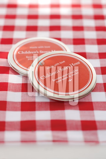 Two homemade CD cases rest on a red gingham picnic tablecloth.