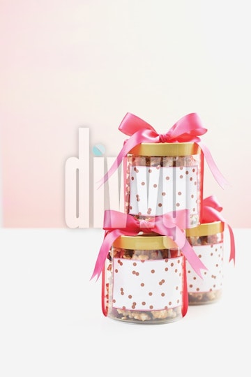 Three jars are filled with popcorn that has been covered in caramel and chocolate and packaged with ribbon and labels for gift-giving.