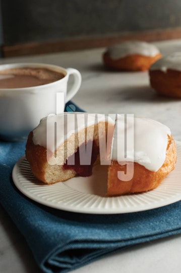 A yeast-raised donut is cut in half to reveal the jelly filling inside.