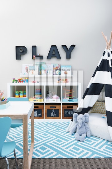Large letters spell out "play" in a neatly-organized black and white kids' playroom with storage in cubbies and a teepee.