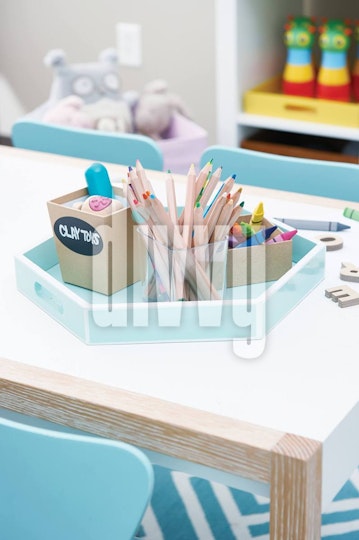 Art supplies are neatly collected on a child-sized table in a playroom.