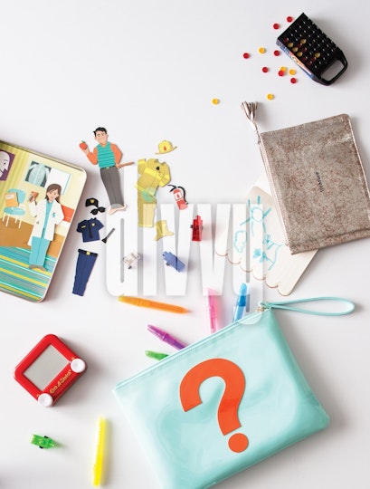 Kids' toys and games spill out of a bag with a question mark onto a white surface.