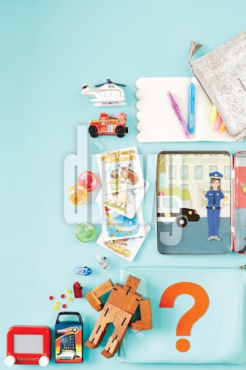 A note pad, colorful pens, helicopter, fire truck, spinners, books, travel ti, pouch, robot, and two games displayed on light blue background.
