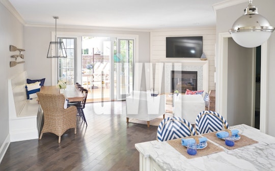 A marble countered island with blue and white striped chairs in foreground, living room with tiled fireplace and dining area with oars on wall in center while large patio sits in background.