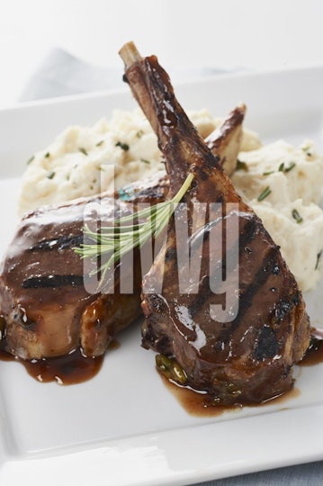 Two grilled bone-in lamb chops covered in sauce rest on a pile of mashed potatoes with a fresh rosemary sprig garnish.