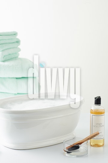 A stain remover and a clothing brush are ready to be used on a white laundry room table next to a tub with soapy water and folded towels.