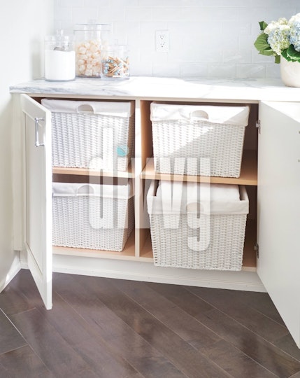 Laundry cabinets are open to reveal organizational baskets; apothecary jars on top of the counter hold laundry supplies near a vase with hydrangeas.