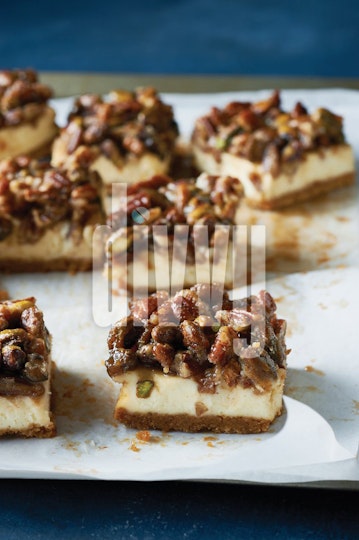 A candied layer of pecans and pistachios sits on top of a cream cheese filling and graham cracker crust for pistachio-pecan cheesecake bars.