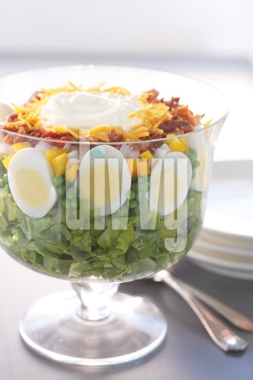 Seven-Layer Lettuce Salad in a Glass Bowl