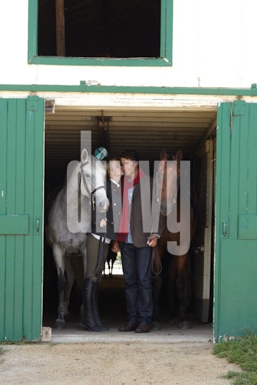 A couple sneak a peck on the cheek as they lead horses out of a stable.