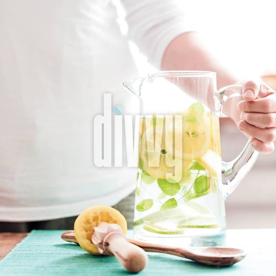 Woman holds onto pitcher of lemon and lime infused water sitting on a teal napkin with wood spoon and juicer resting in front.