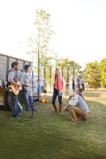Two men play guitar for an audience at a fall harvest party.