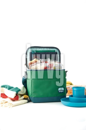 A green lunchbox cooler is filled with food in plastic bags and surrounded by travel supplies on a white background.