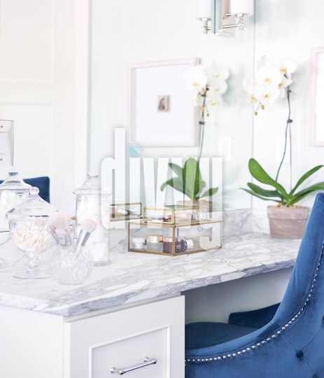 Makeup and skin care items are organized on a vanity in a luxurious bathroom with marble countertops and blue velvet chair.