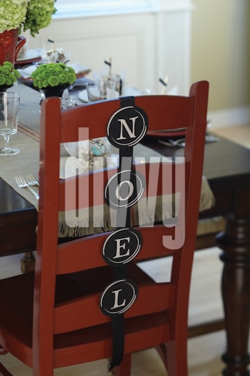 Mahogany chair at set table with a hanging noel sign draped over the back.