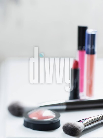 Lip glosses, lipstick, blush and makeup brushes are gathered on a white surface.
