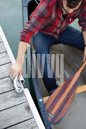 A man in a flannel shirt holds an oar as he docks a canoe.