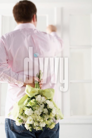 Man in pink button up shirt holds a bouquet of white flowers behind his back as he knocks on a door.