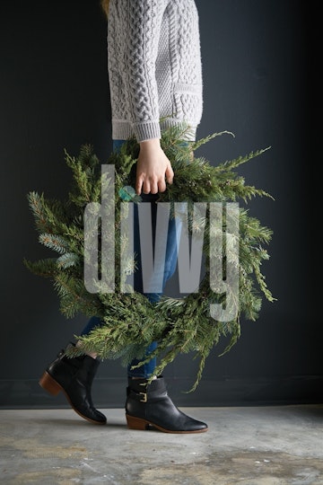 A woman in a cozy cabled sweater holds a dark wreath of mixed evergreens against a dark background.