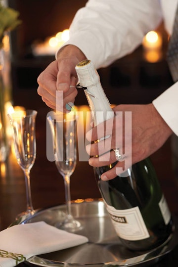 A man tears away the wrapping around the neck of a bottle of champagne in front of two champagne flutes.